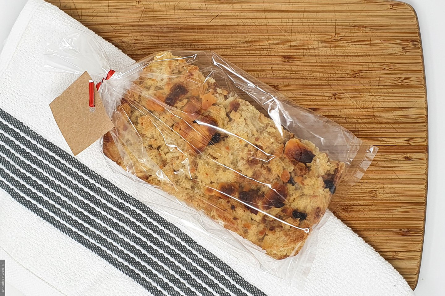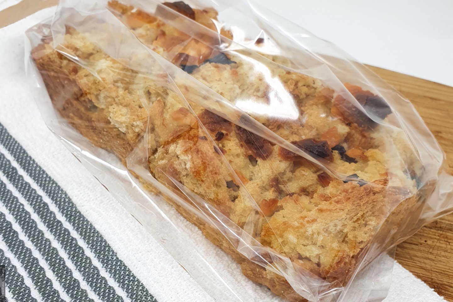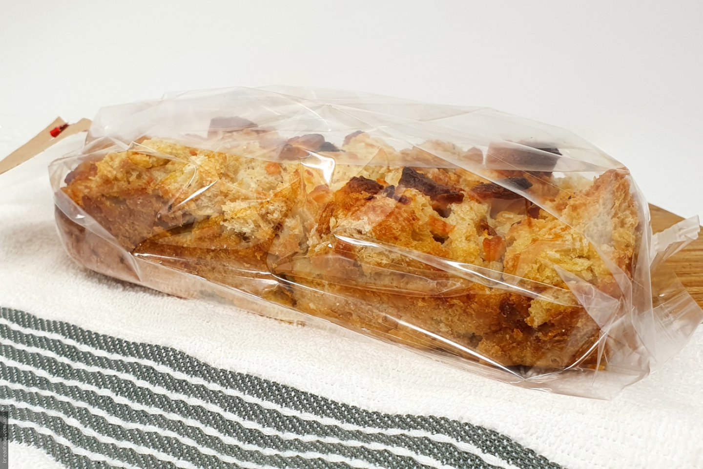 Budín elaborado con nuestro pan, queso y pasas, con un suave sabor dulce a leche y mantequilla. Barra de 18cm
